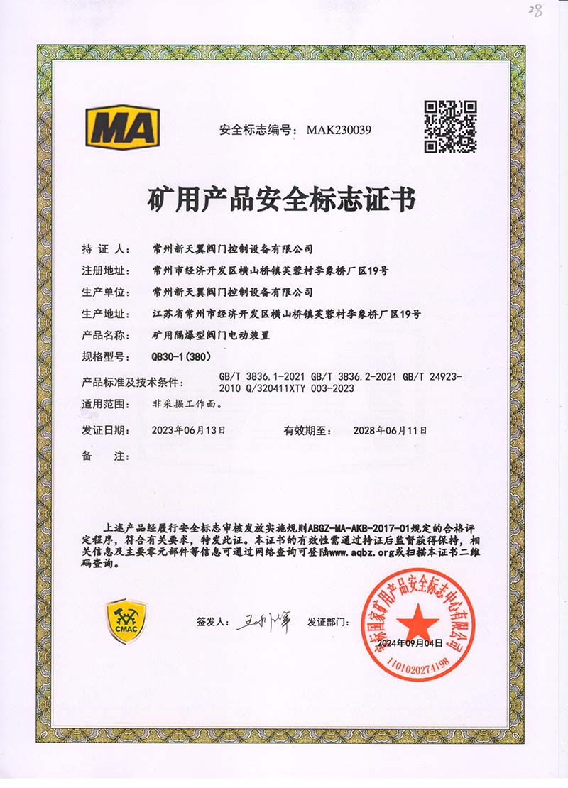 礦用產品安全標志證書QB30-1(380)