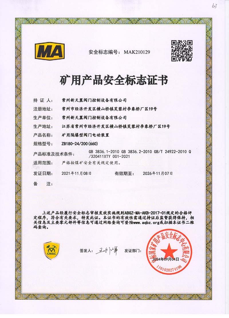 礦用產品安全標志證書ZB30-24 200(660)